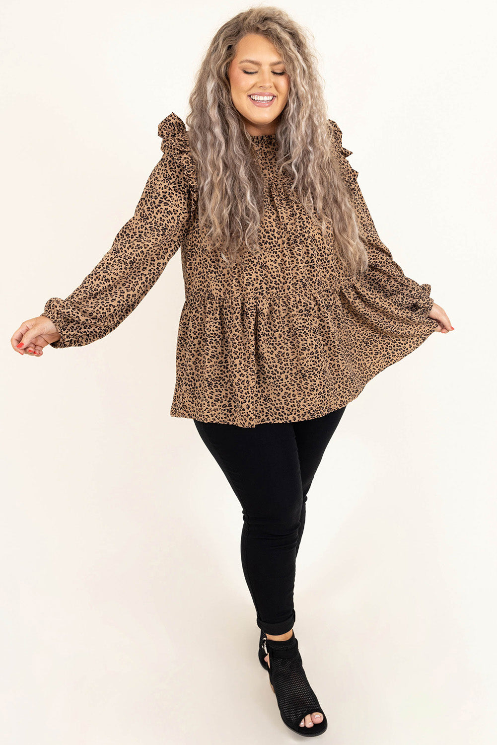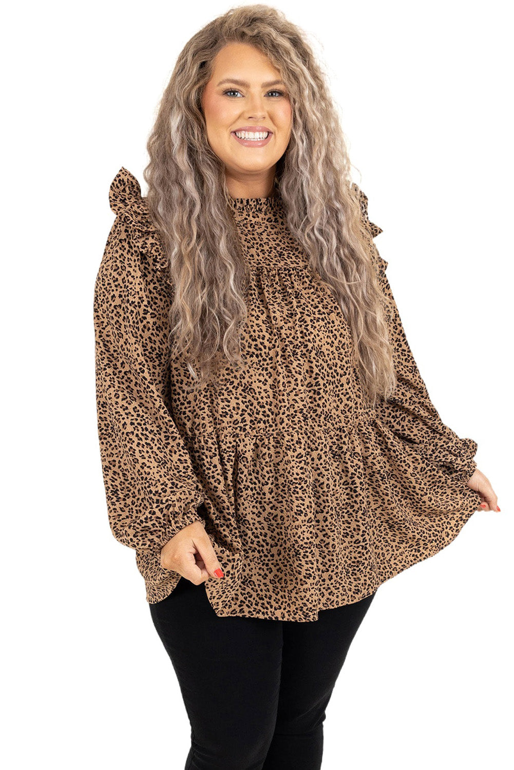 Leopard Frilled Shoulder Decor Plus Size Babydoll Top