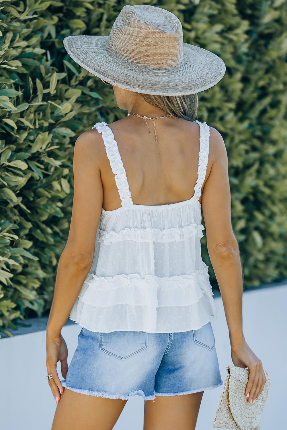 White Swiss Dot Tiered Ruffled Deep V Neck Tank Top