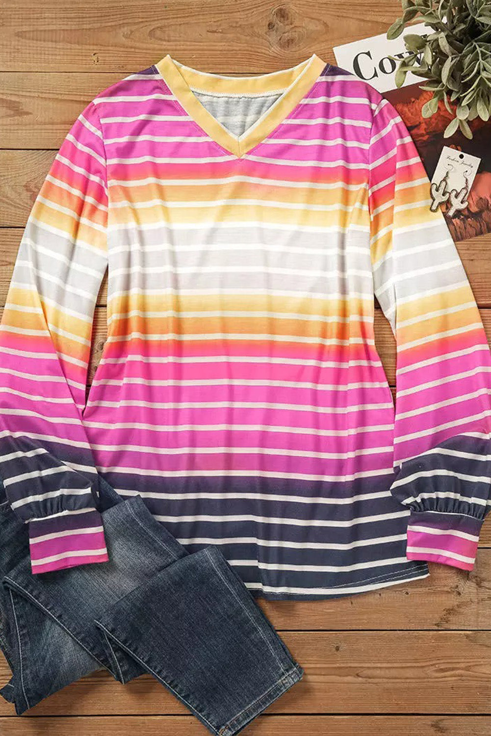 Multicolor Gradient Striped Long Sleeve V-Neck Blouse