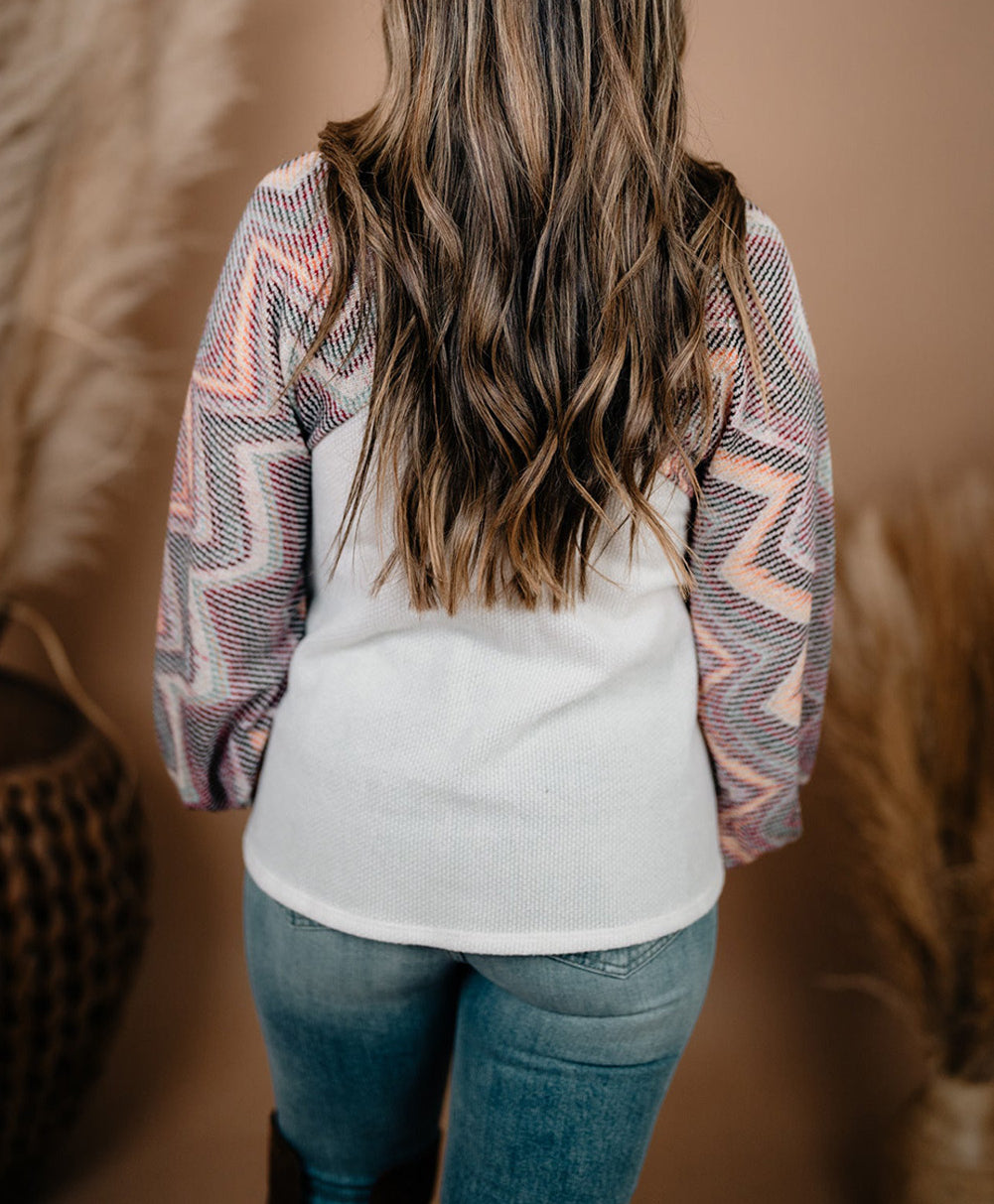 - The combination of geometric print and Bishop sleeve is unique and eye-catching