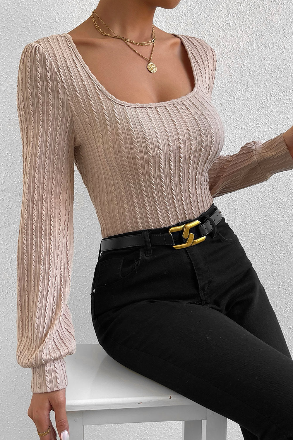Square Neck Bubble Sleeve Textured Knit Top