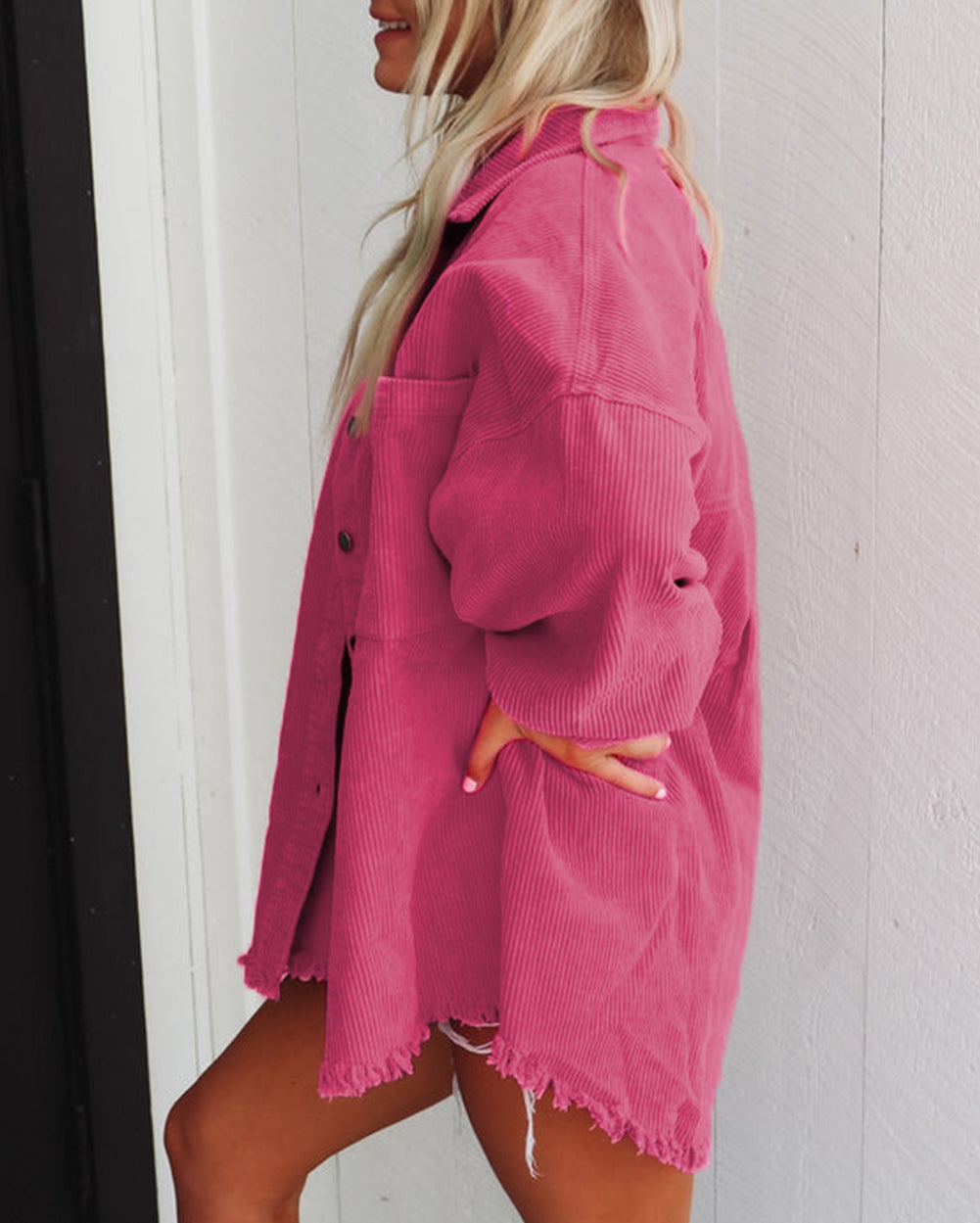 Corded Dual Chest Pocket Raw Hem Shacket