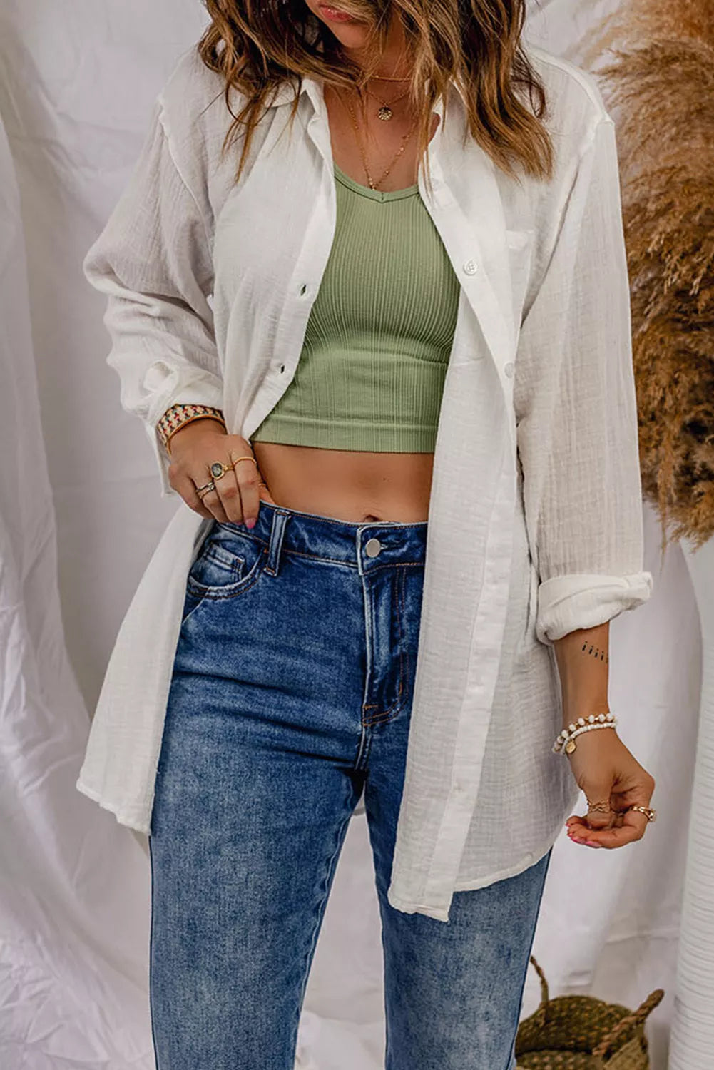 - Featured with a turn-down collar, long sleeve, button front closure, and loose fit