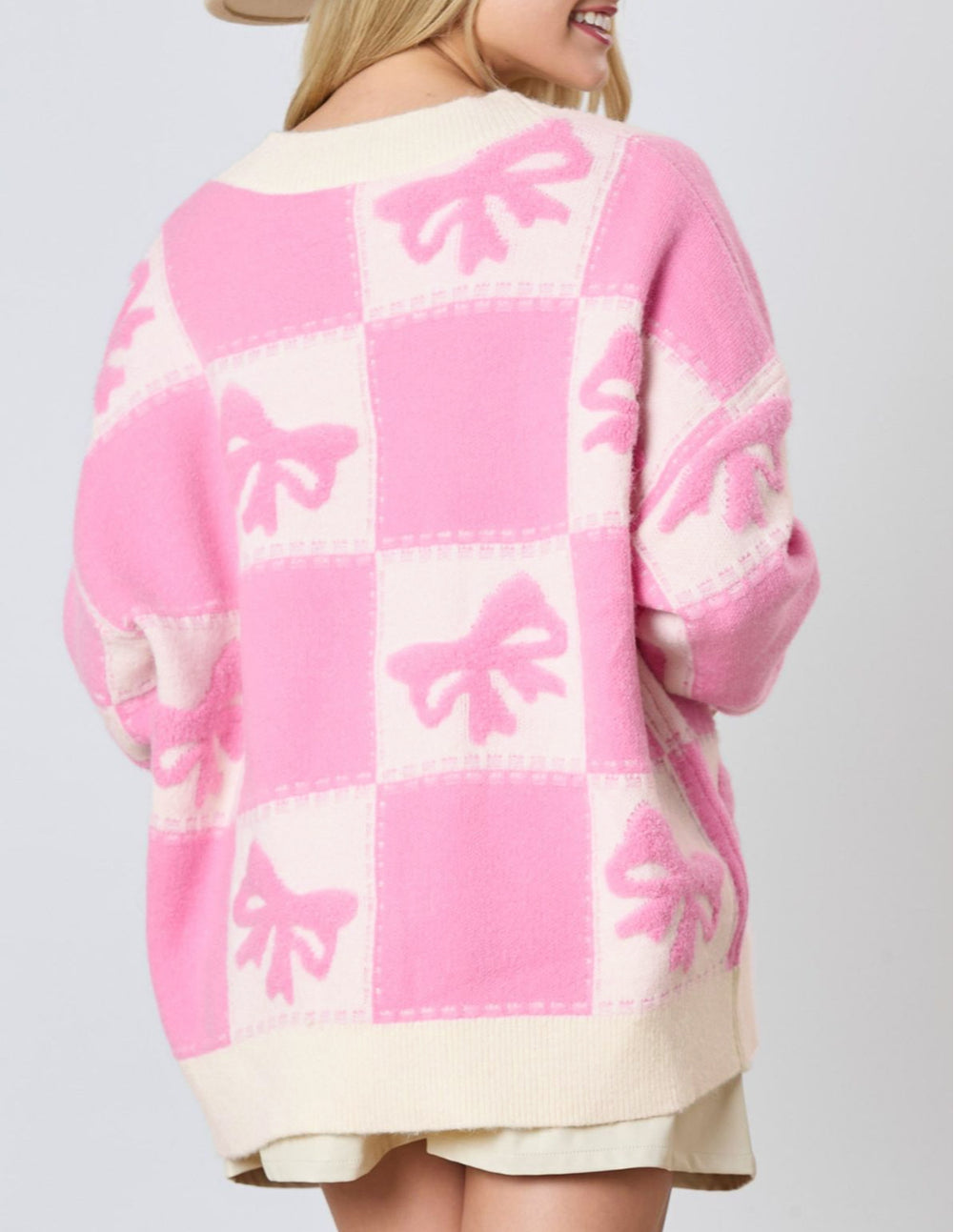 Bowknot Checkered Pattern V Neck Drop Shoulder Button Up Cardigan