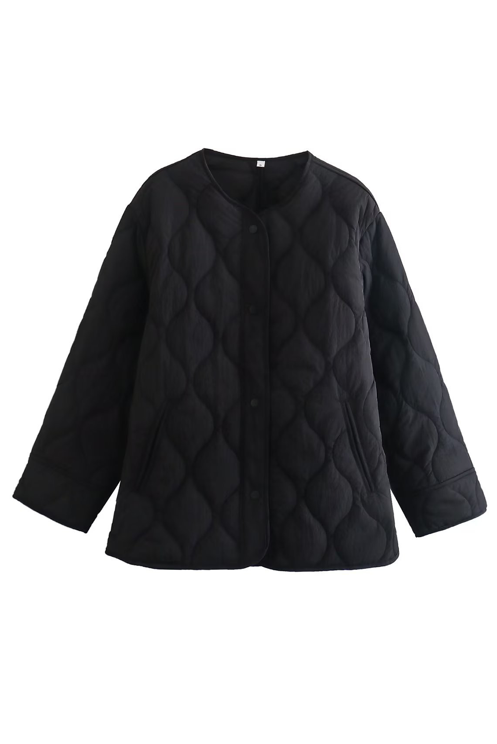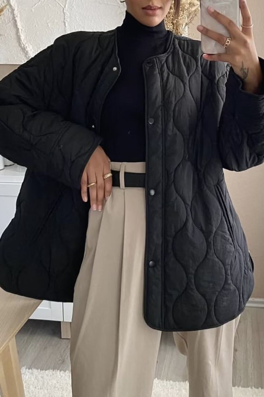 - The solid-color puffer jacket is a functional choice for cold weather.