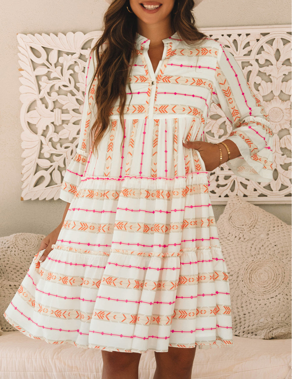 - Vibrant bohemian pattern infuses the dress with a free-spirited, artistic vibe.
