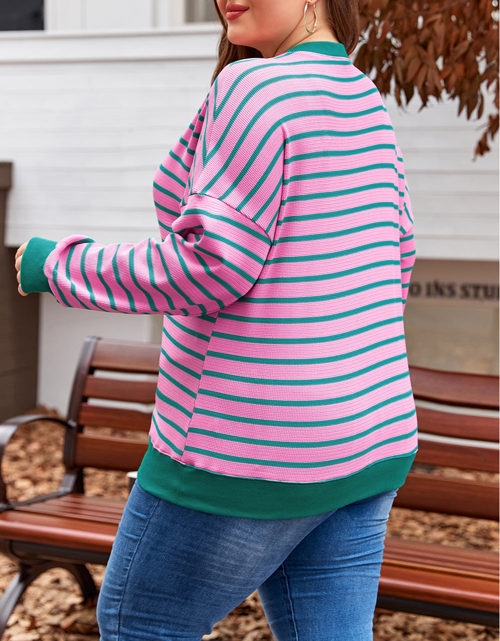 Stripe Waffle Knit Crew Neck Plus Size Sweatshirt