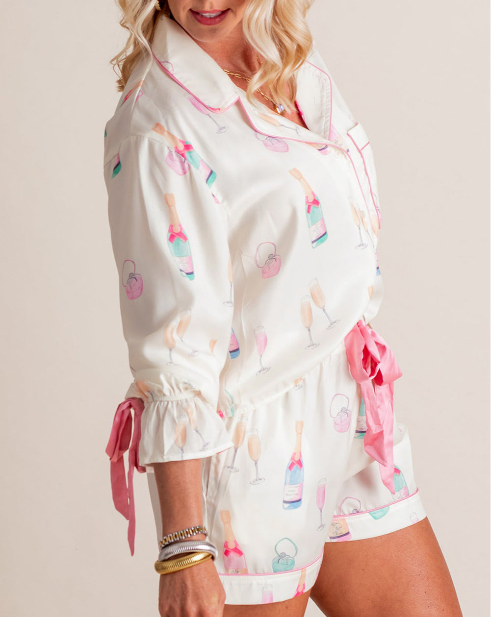 Plus Size Wine Glass Print Bow Knot Pajama Set