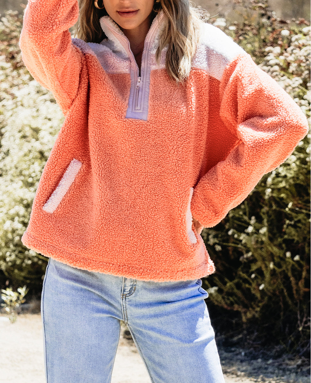 Colorblock Half Zipper Stand Neck Sherpa Sweatshirt