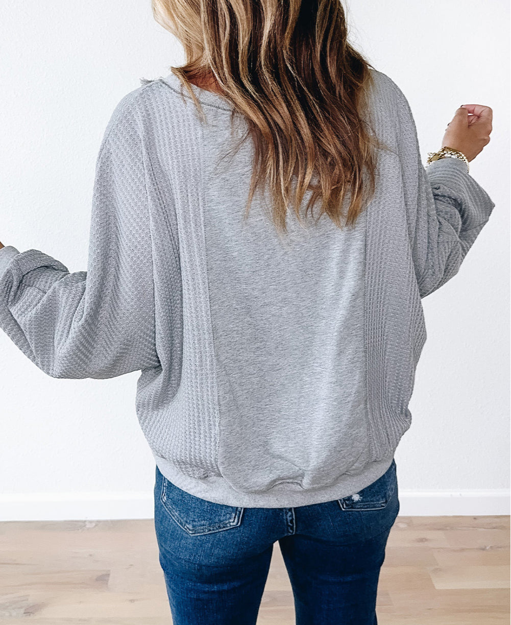 Waffle Patchwork Long Sleeve Raw Hem Pullover Top
