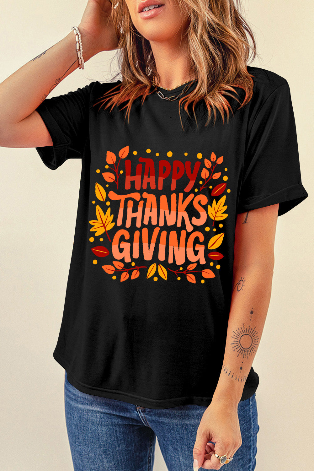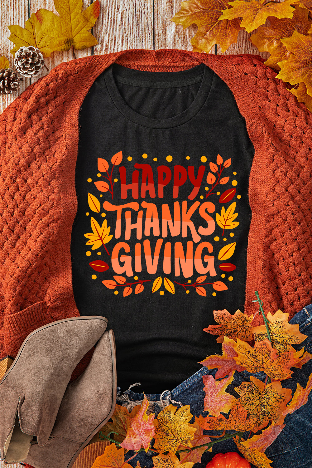 Happy Thanksgiving Leaves Print Crew Neck T Shirt