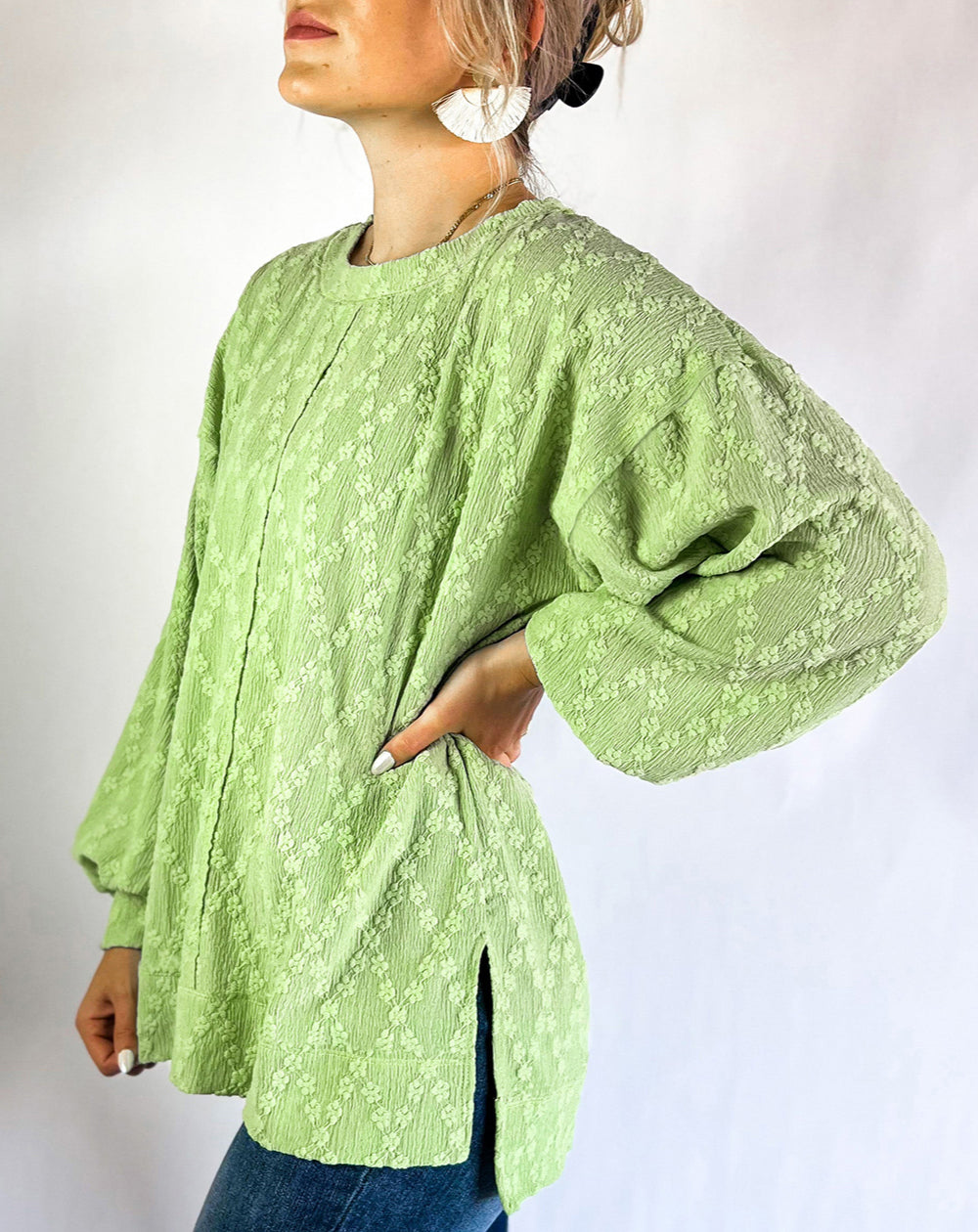 - The side split detail adds a stylish touch to the crew neck blouse.