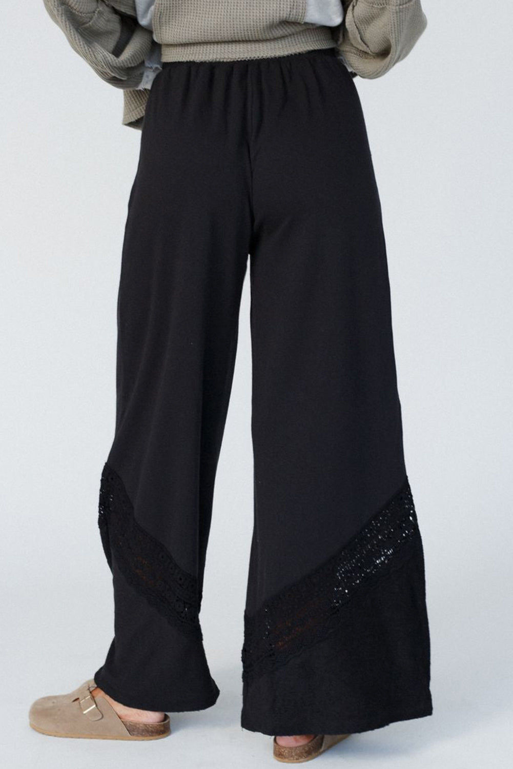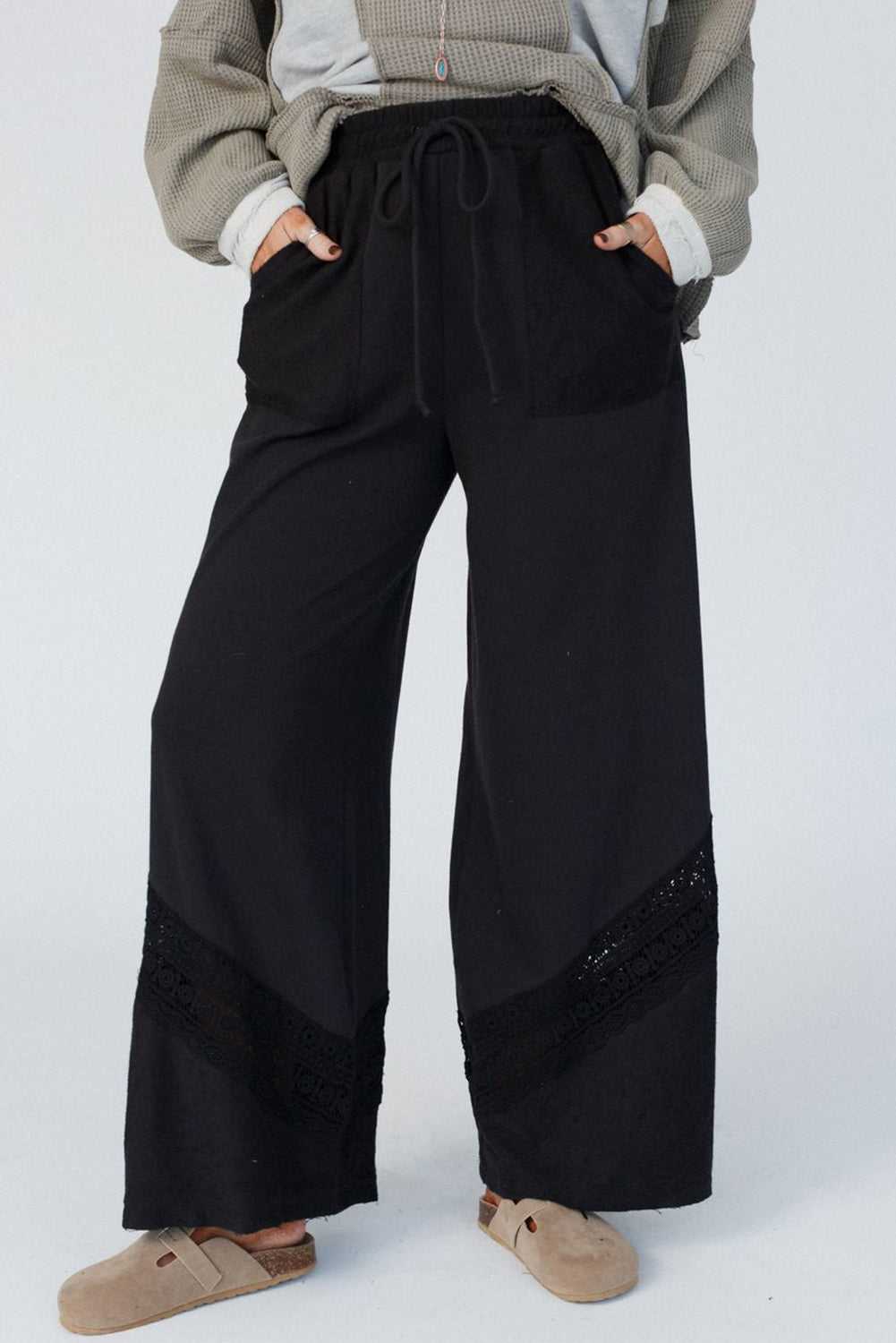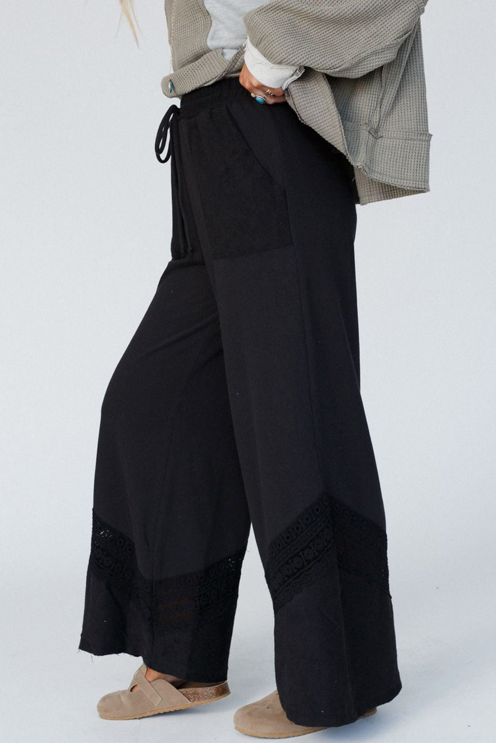 Lace Crochet Patched Lace-up High Waist Wide Leg Pants