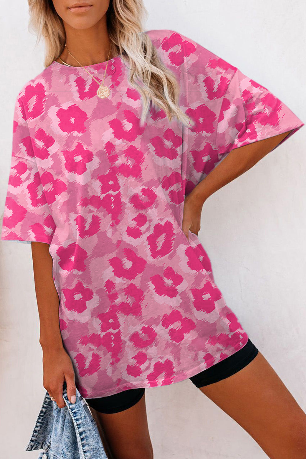 Pink Leopard Print Half Sleeve Oversized T Shirt