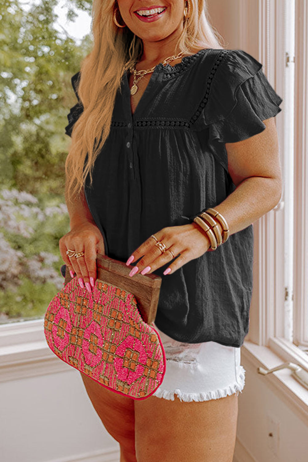 Crochet Split V Neck Ruffle Sleeve Plus Size Blouse
