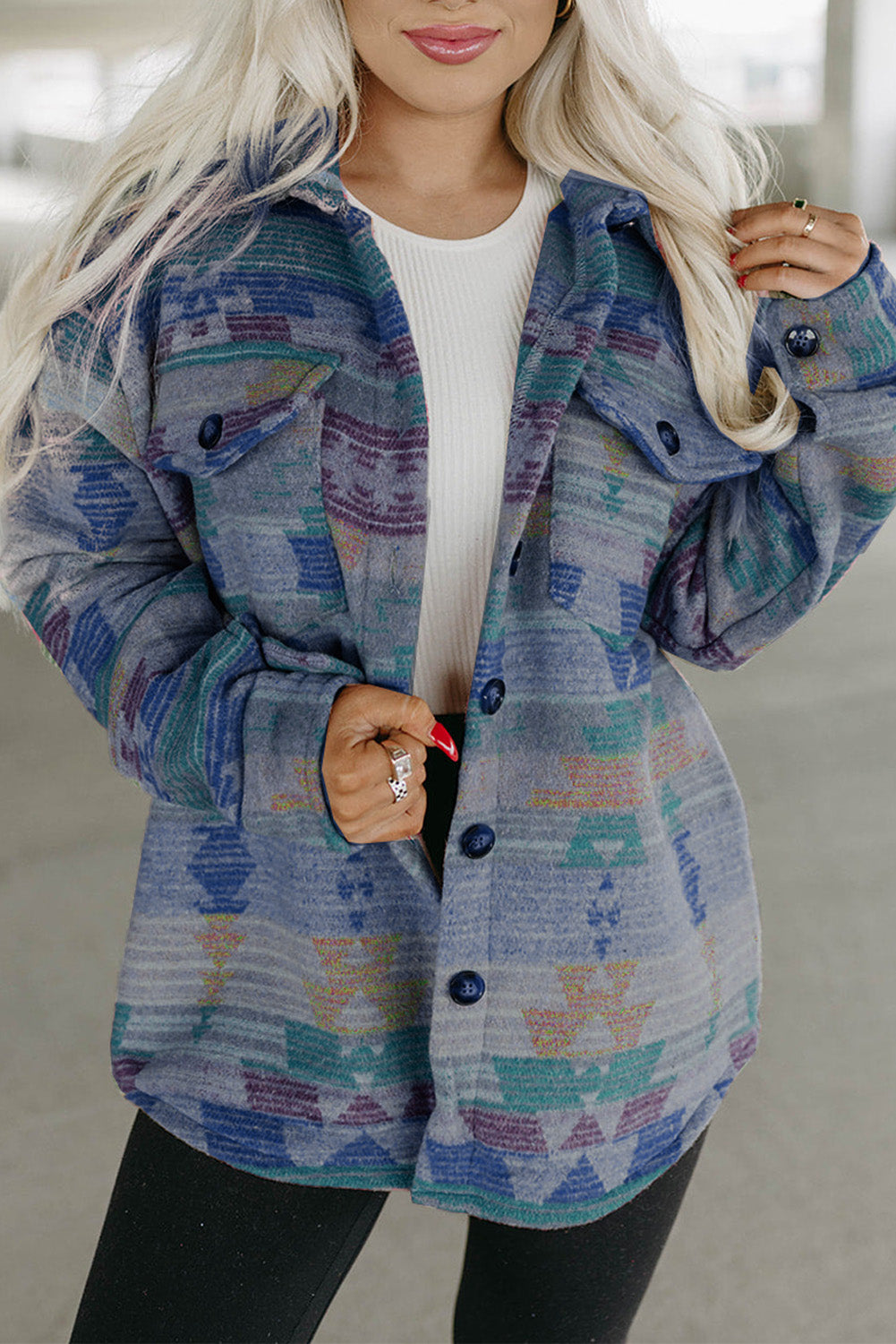 - Western-inspired Aztec print makes this shacket unique and fashionable