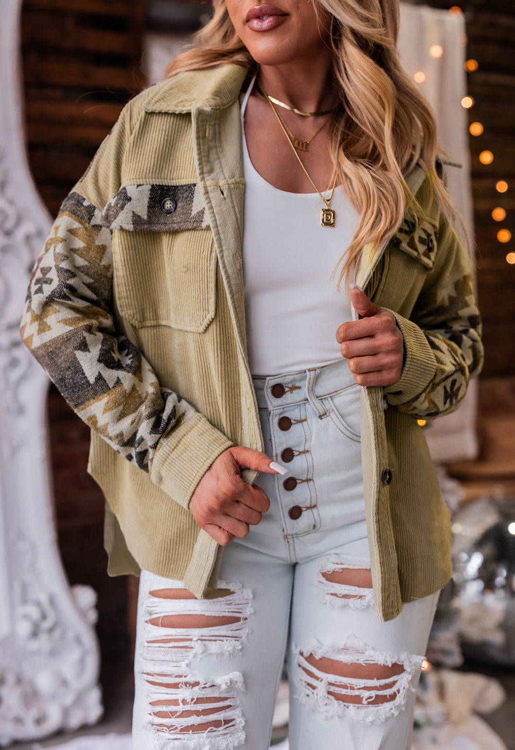 Aztec Print Patchwork Frayed Edge Corduroy Jacket