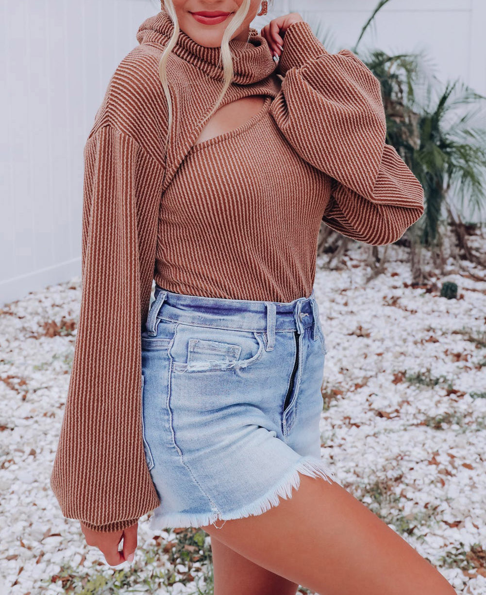 - The matching bolero has a turtle neck, long balloon sleeves, and ribbed cuffs