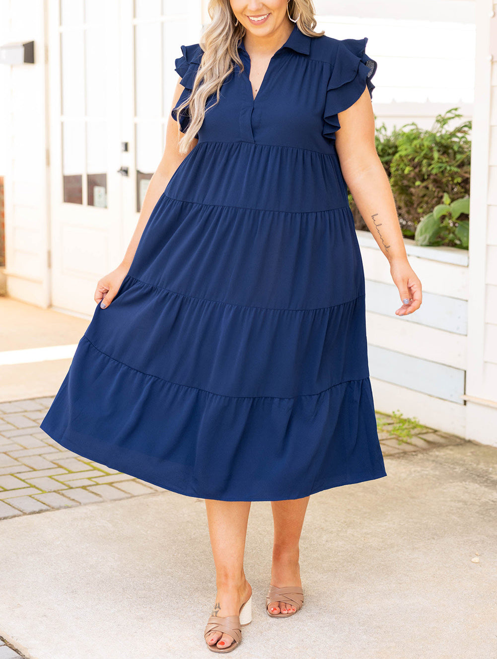 Blue Plus Size Ruffled Tiered A-line Midi Dress