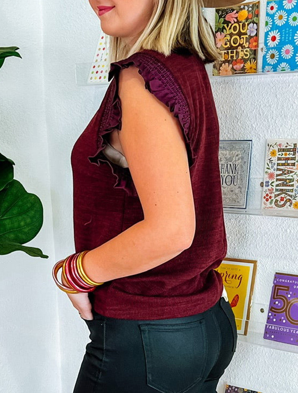 The flutter sleeves add visual interest, making it perfect for both casual and dressier occasions