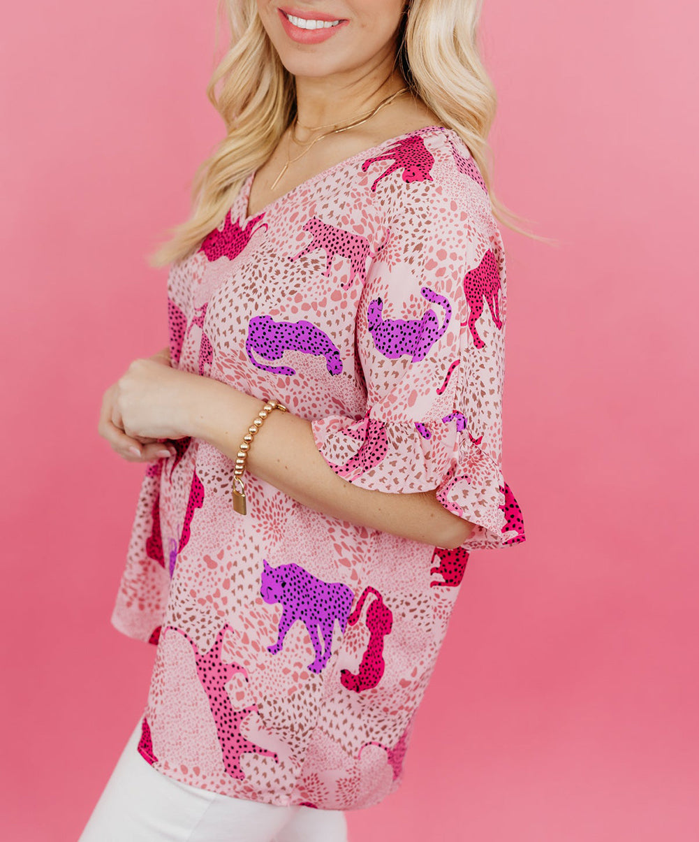 Pink Plus Size Jaguar Print Ruffled Short Sleeves Top