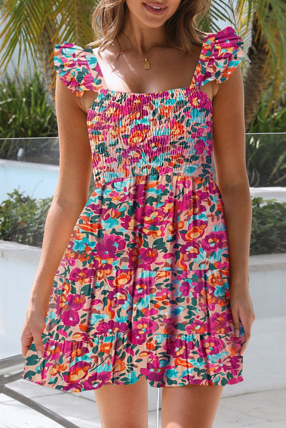 Ruffled Shirred Sleeveless High Rise Floral Mini Dress