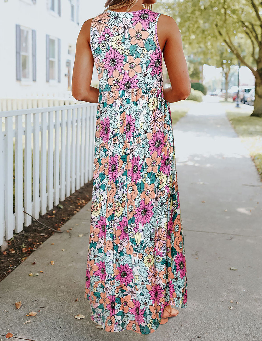 This floral dress with a flattering high waist design for a slimming effect The maxi length creates a flowy, effortless look for ladies Sleeveless style perfect for warmer weather Perfect for casual outings or special occasions Wholesale floral dresses are fashionable and elegant 90%Polyester+10%Elastane