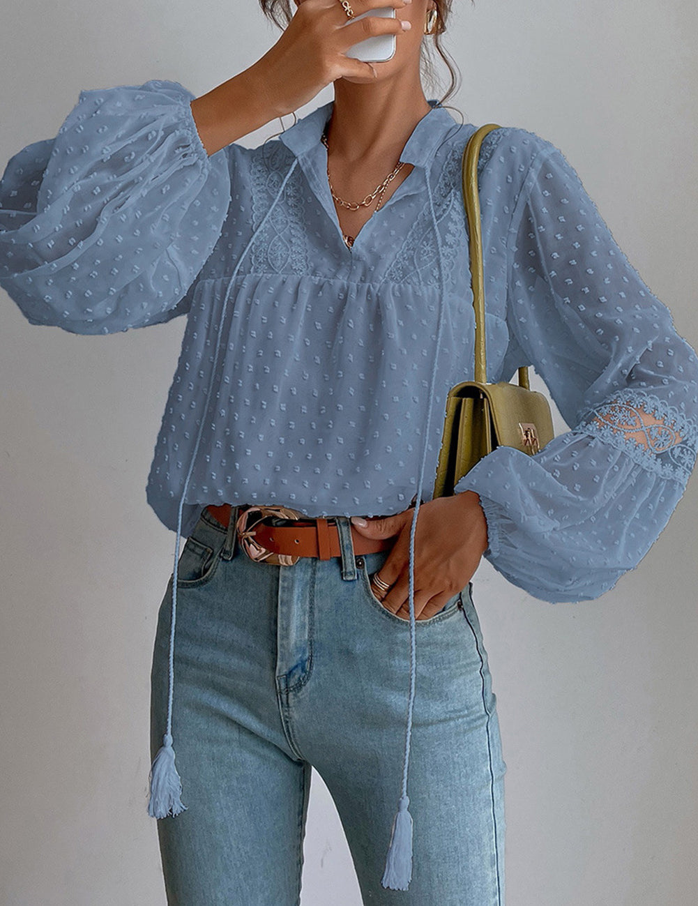 This lace blouse features a feminine babydoll silhouette Solid color design for a versatile and timeless look Trendy balloon sleeves for a playful touch Elegant lace material with delicate swiss dot texture Wholesale blouses are perfect for both casual outings and special occasions 100%Polyester