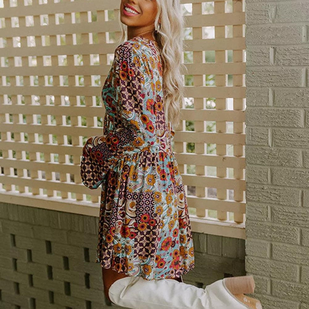 - Featured with a v-neckline, bell sleeve, boho floral print, and above-knee length